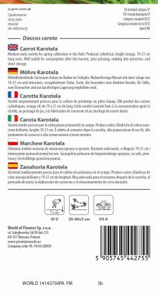 An early, Nantes-type variety for growing in the field and in greenhouses for early harvest. Produces cylindrical, 16 to 18 cm long roots that do not green. Consists of bright orange, delicious, and juicy flesh. To be eaten after the harvest.
