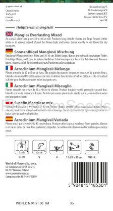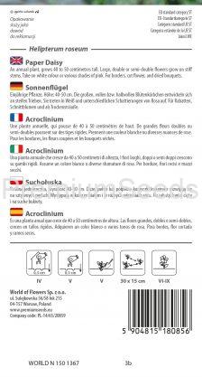 Einjährige Pflanze mit einer Höhe von 30-40 cm. Bildet lange, dünne und schwach verzweigte Triebe. Prächtige Blüten, weiß bzw. in unterschiedlichen Schattierungen von Rosa. Für Rabatten und Blumenbeete. Hauptsächlich für Schnittblumen zu Trockensträußen angebaut.
