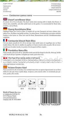 Einjährige Pflanze von 30-40 cm Höhe. Es handelt sich um eine Zwergsorte mit einer schönen, kompakten Form. Die Blüten sind gefüllt und blau. Sie ziehen Bienen, Schmetterlinge und andere nützliche Insekten in den Garten an. Diese Sorte wird für Beete, Blumenwiesen und den Schnittblumenanbau empfohlen.