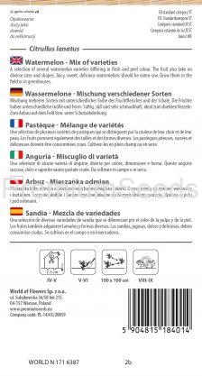 Una selección de diversas variedades de sandía que se diferencian por el color de la pulpa y de la piel. Los frutos también adquieren tamaños y formas diversas. Las sandías, jugosas, dulces y deliciosas, deben consumirse crudas. Se cultivan en el campo o en invernaderos.