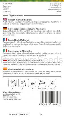 Planta anual que crece de 30 a 40 cm de altura. Crecimiento denso. Florece larga y abundantemente. Flores grandes y dobles en varios tonos de amarillo y naranja. Perfecta para parterres y macetas.
