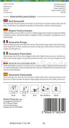 Planta anual que crece entre 40 y 60 cm de altura. Produce tallos erectos y hojas decorativas de color rojo oscuro. Las flores escarlatas se reúnen en largas espigas. Para parterres, flor cortada y ramos secos.
