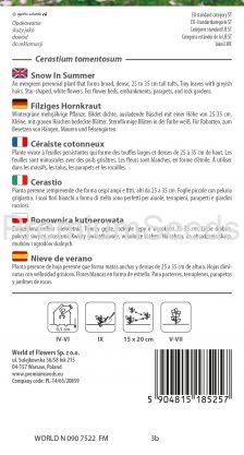 Planta perenne de hoja perenne que forma matas anchas y densas de 25 a 35 cm de altura. Hojas diminutas con vellosidad grisácea. Flores blancas en forma de estrella. Para parterres, terraplenes, parapetos y jardines de rocas.