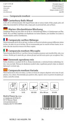 A 60 to 80 cm tall biennial plant. Bell-shaped flowers take on various shades of blue, purple, pink, and white. Recommended for tall flower beds, empty spots on perennial beds, and cut flower.