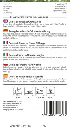 A 20 to 30-cm tall annual plant. Feathery flower clusters take on various bright colours. Suitable for flower beds, lawns, and borders. Grows well in pots. A nice cut flower.