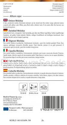 A late, productive variety. Extremely resistant; can be stored over the winter. Large, spherical onions covered with yellow scale. White, juicy flesh with a distinct taste. To be eaten after the harvest; can be stored long term. Coating ingredients: peat, dolomite, clay.