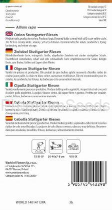 A late, vigorous variety. Produces extremely large bulbs that weigh up to 1 kilogram. A sugar onion variety with a mild, sweet taste. To be eaten after the harvest; can be frozen or dried. Coating ingredients: peat, dolomite, clay.