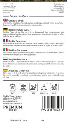 A 50-60 cm tall annual plant. Presented variety produces dark green, intensely scented leaves. Particularly recommended for pesto, sauces, casseroles, soups, and pizza.