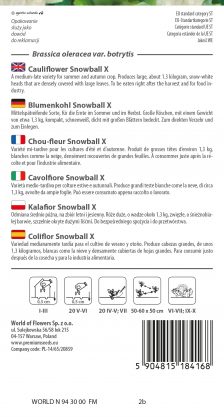 A medium-late variety for summer and autumn crop. Produces large, about 1.3 kilogram, snow-white heads that are densely covered with large leaves. To be eaten right after the harvest and for food industry.
