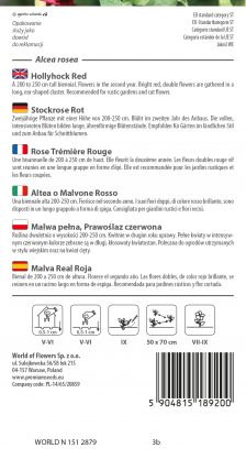 A 200 to 250 cm tall biennial. Flowers in the second year. Bright red, double flowers are gathered in a long, ear-shaped cluster. Recommended for rustic gardens and cut flower.