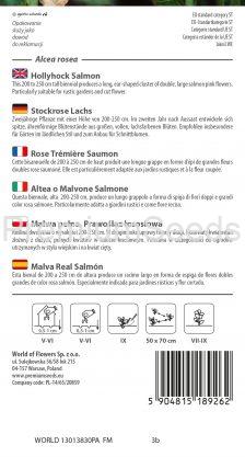 This 200 to 250 cm tall biennial produces a long, ear-shaped cluster of double, large salmon pink flowers. Particularly suitable for rustic gardens and cut flower.