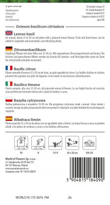 An annual, about 35 to 50 cm tall plant with a pleasant lemon flavour. Fres and dried leaves can be added to vegetable and meat dishes and refreshing drinks.