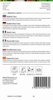 Early variety for spring and autumn growing in the field. Produces medium-sized, round roots covered with red-white skin. White, crunchy, rather savoury flesh. To be eaten raw or cooked.